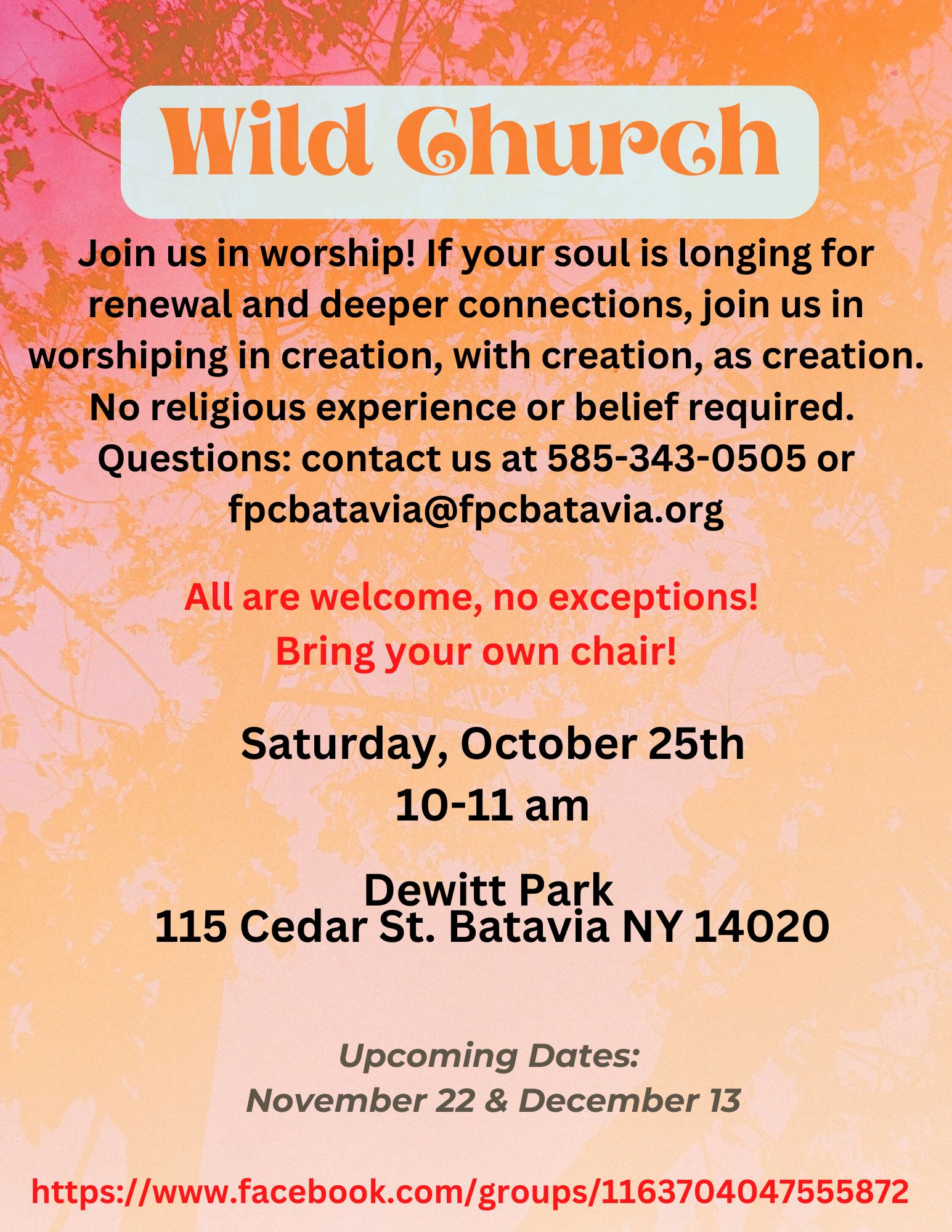 DeWitt Recreation Area Batavia, NY, United StatesJoin us in worship! If your soul longs for renewal and deeper connections, join us in worshiping in creation, with creation, as creation. No religious experience or belief is required. Questions: contact us at 585-343-0505 All are welcome, no exceptions! Bring your own chair!