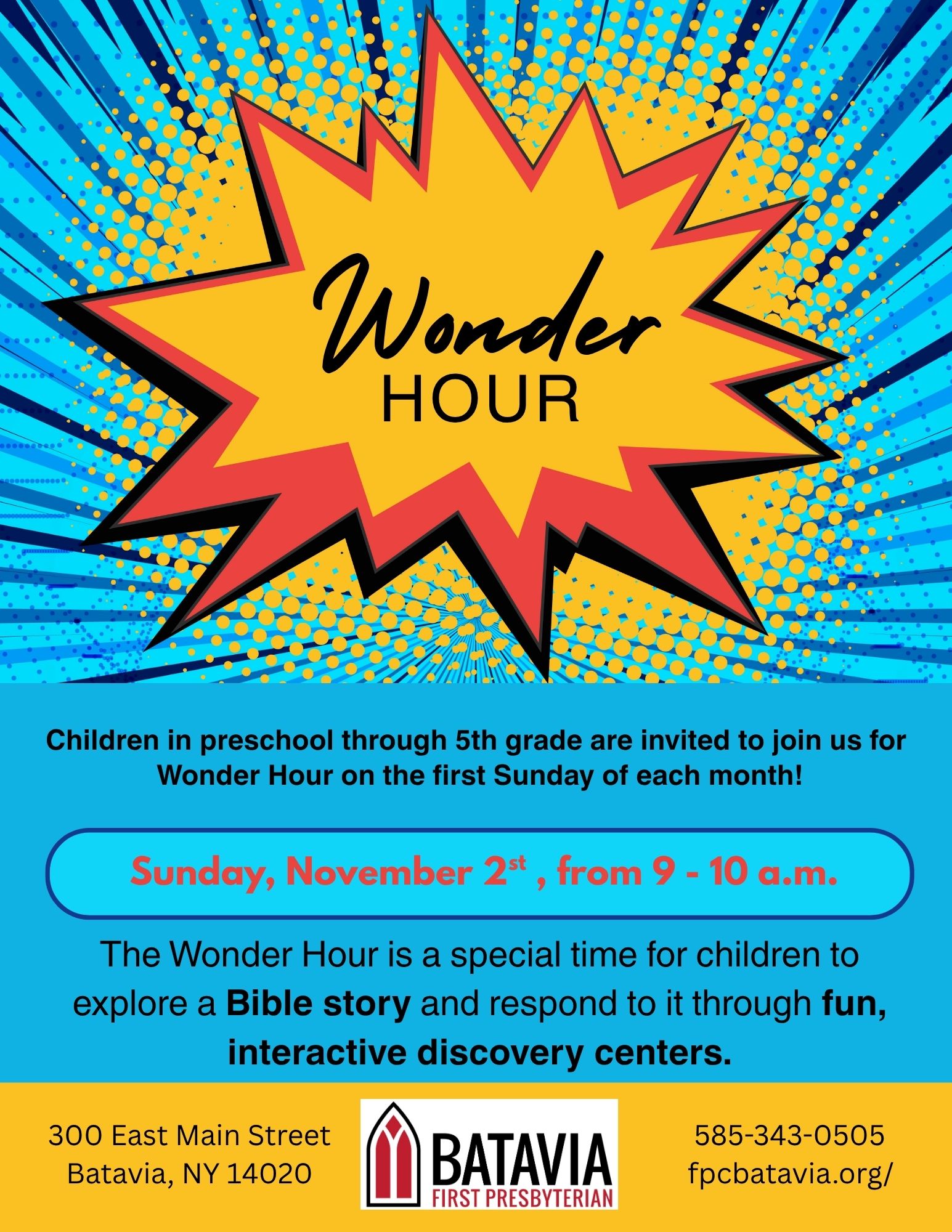 Batavia FPC 300 Main Street, Batavia, United StatesThe Wonder Hour is a special time for children to explore a Bible story and respond to it through fun, interactive discovery centers.