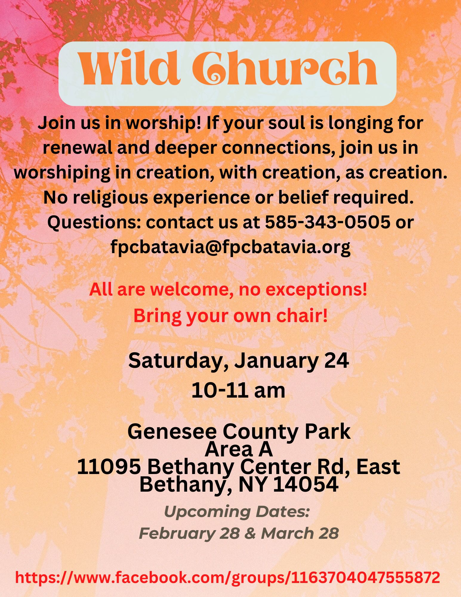 Genesee County Park 11095 Bethany Center Rd, East BethanyJoin us in worship! If your soul longs for renewal and deeper connections, join us in worshiping in creation, with creation, as creation. No religious experience or belief is required. Questions: contact us at 585-343-0505 All are welcome, no exceptions!