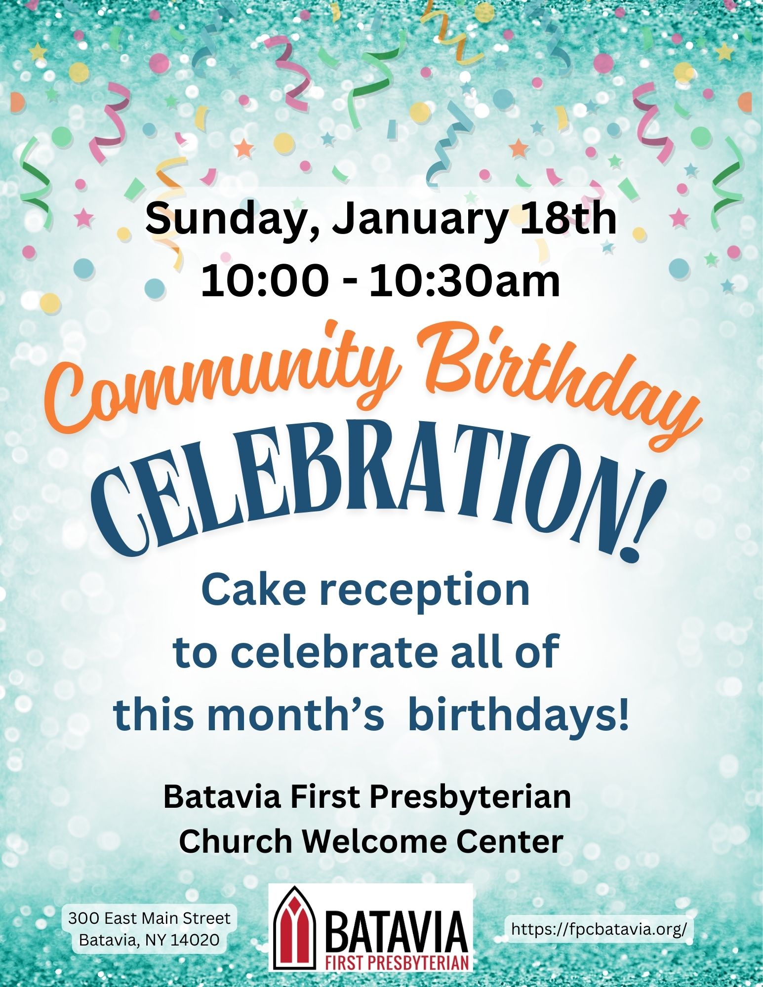 Batavia First Pres. 300 East Main Street, Batavia, NY, United StatesJoin us for a cake reception to celebrate all of this month’s birthdays!