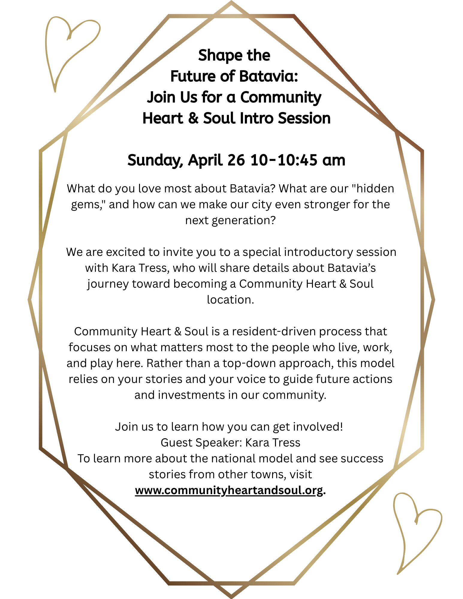 Batavia First Pres. 300 East Main Street, Batavia, NY, United StatesWhat do you love most about Batavia? What are our "hidden gems," and how can we make our city even stronger for the next generation? We are excited to invite you to a special introductory session with Kara Tress, who will share details about Batavia’s journey toward becoming a Community Heart & Soul location. Community…