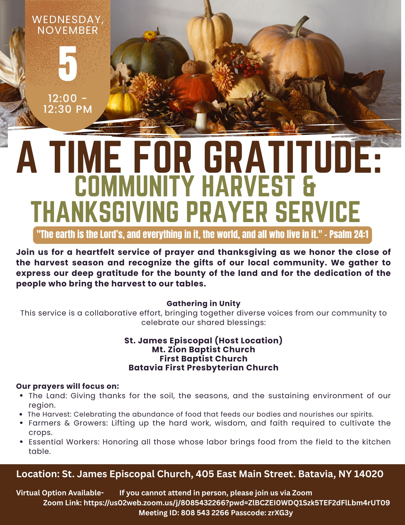 Join us for a heartfelt service of prayer and thanksgiving as we honor the close of the harvest season and recognize the gifts of our local community. We gather to express our deep gratitude for the bounty of the land and for the dedication of the people who bring the harvest to our tables.